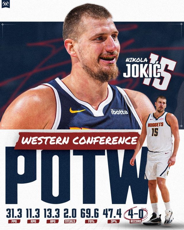 西部周最佳:约基奇(掘金)这是约基奇本赛季首次斩获该奖项,其职业生涯至今已18次当选西部周最佳球员,在掘金队史上排名第一。过去这一周,30岁的约基奇场均贡献31.3分、11.3个篮板、13.3次助攻和2.0次抢断,投篮命中率达69.6%,三分命中率为47.4%,带领掘金队取得了4胜0负的不败战绩。