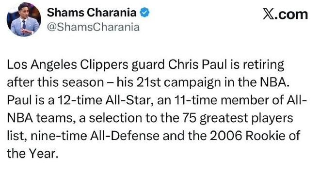 只是保罗已经在对阵黄蜂的比赛之前,他通过社媒宣布:“回到北卡州……多么精彩的一段旅程……依然有许多不舍……非常感激这最后一程。”保罗确认本赛季是他生涯最后一个赛季。保罗在本赛季状态断崖式下滑,他本赛季出场11场均是替补登场,场均14.5分钟仅得到2.5分2篮板3.7助攻0.9抢断,投篮命中率低至26.3%,三分命中率28.0%。