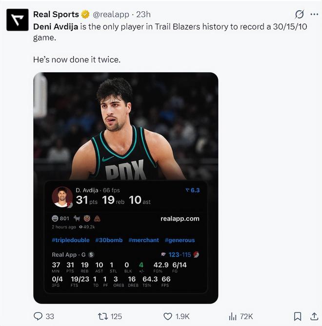 这场比赛阿夫迪亚也一战创造多项纪录:1.职业生涯第四次三双;2.生涯第二次30+三双,本赛季第二多的30+三双;