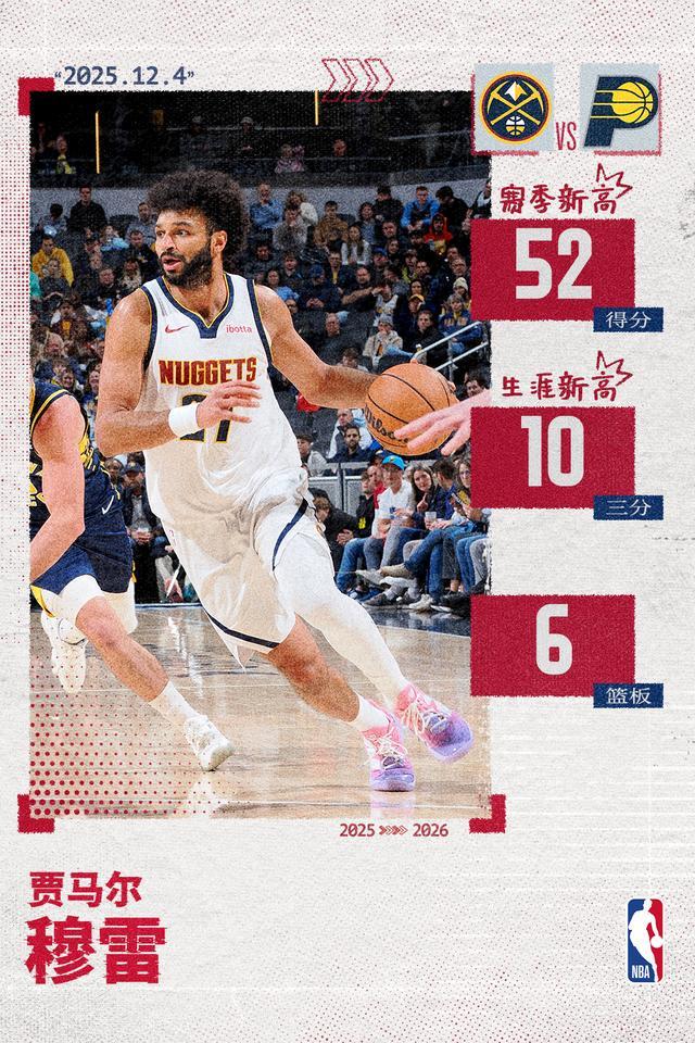 北京时间12月4日,NBA常规赛,掘金客场135-120轻取步行者。本场比赛,掘金球星贾马尔-穆雷投篮25中19,三分球11中10,罚球5中4,爆砍赛季新高52分另有6篮板4助攻1抢断,10记三分创生涯单场纪录。此战过后,穆雷掘金生涯第三次单场斩获50+,升至掘金队史第二,仅次尼古拉-约基奇(4次)。(NBA官网)