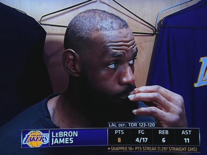 其实,上一场就“危了”。对阵太阳,詹姆斯前三节仅得6分,末节靠罚球和三分惊险延续纪录至1297场。在胜负已定的时候他还在场上,受到过“刷分”的质疑。今天用这种方式,断了纪录,从一个球迷的角度看,我觉得是“好事”。如果你看了比赛就会明白,这对于詹姆斯和湖人全队来说,那是纪录,也是一种无形的“枷锁”。大家都会想着这件事。最典型的,有一个回合,里夫斯明明有自己干的机会,却选择了传给詹姆斯,很是别扭。詹姆斯自己呢,也打得不自在。17中4,面对猛龙的锋线群,确实是打得差。断了以后,可以做到轻装上阵了。最后一攻的选择,如果八村最终没投进,那肯定又是另一种互联网风评。球迷习惯就好。但对于詹姆斯来说,这就是他的比赛方式。他赛后的表达:“我想把他安排在终结位置,我看向猛龙的替补席,显然我们并不想暂停比赛。我们当时的进攻节奏很好。奥斯汀整晚手感都很热。我看到对方教练在指示斯巴恩斯可能进行包夹,所以我想让八村塁留在同一侧,把他作为我的终结选择。”万幸的是,八村很争气。