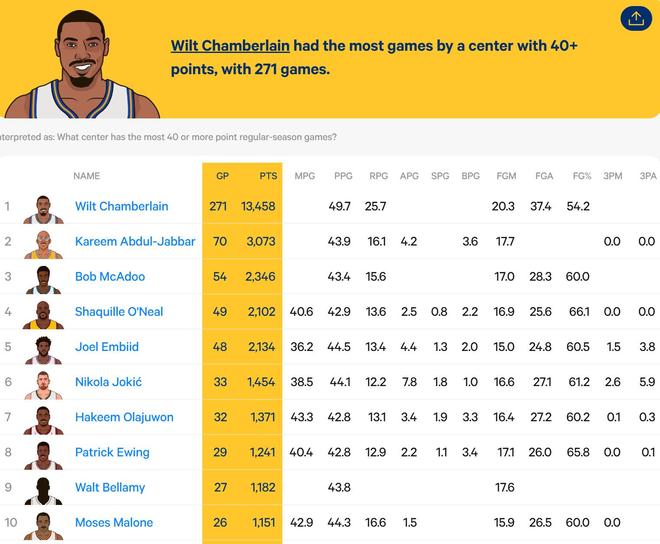 本场比赛,掘金队当家球星约基奇出场35分36秒,26投13中砍下了40分9篮板8助攻的准三双数据,另有1抢断1盖帽入账,三分球8中1,罚球15中13,出现了2次失误和1次犯规,正负值为-15。据统计,本场比赛是约基奇职业生涯第33次砍下40+得分,他超越了奥拉朱旺,成为NBA历史上单场40+得分场次数第六多的球员。在他身前的分别是张伯伦(271)、贾巴尔(70)、麦卡杜(54)、奥尼尔(49)和恩比德(48)。