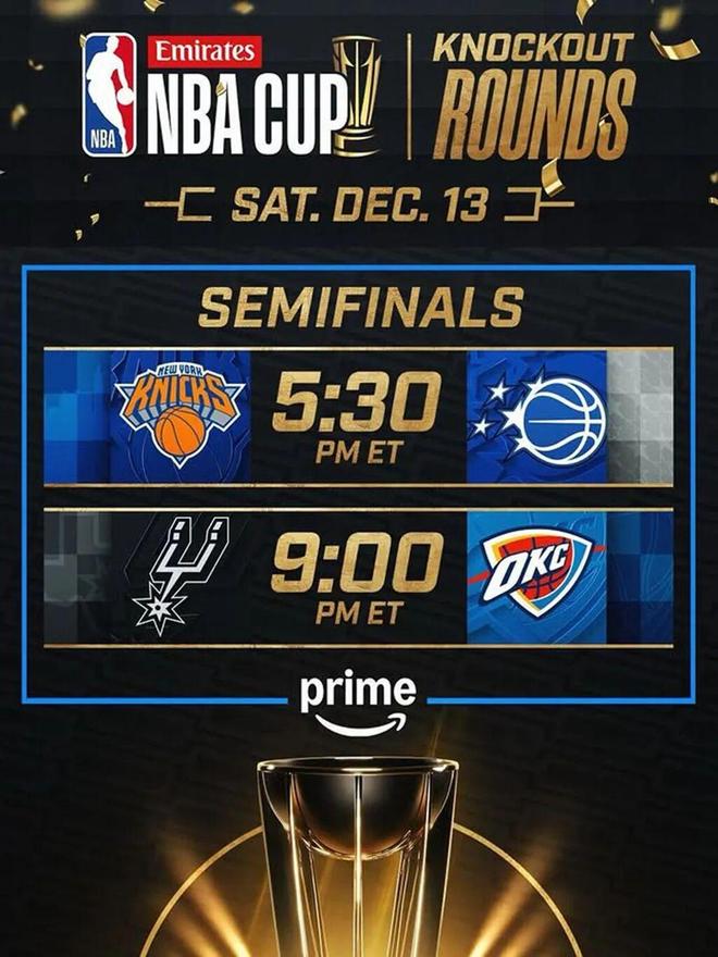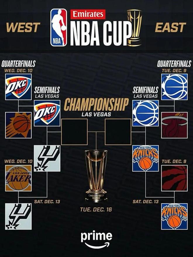 东部这边,尼克斯将于魔术展开对决。四支球队将会师赌城拉斯维加斯,究竟谁能拿下第三座 NBA 季中赛冠军奖杯,拿下 50 万美元奖金呢?我们拭目以待。