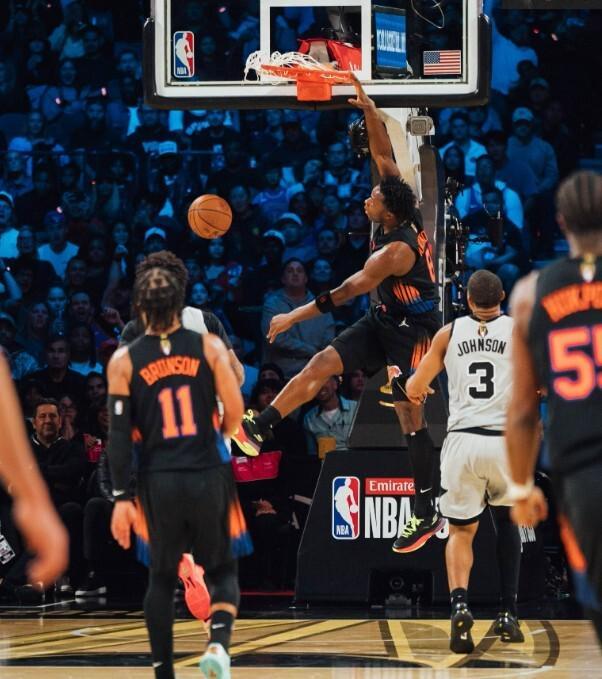 第二节马刺外线三分接连发力,分差有逐渐拉开之势。后半段马刺命中率下降,尼克斯开始追上来。阿努诺比连拿4分,尼克斯在最后28秒追到59-59。福克斯的中距离命中,帮助马刺半场61-59领先。第三节上来福克斯连续两记三分,马刺67-59将分差拉开到8分。中段马刺打出一波10-3的攻势,82-71分差来到两位数。克拉克森和科勒克先后命中三分,尼克斯追回到5分差距。三节比赛战罢,马刺94-89领先。末节克拉克森两记三分命中,尼克斯打出8-0的开局,一举实现反超。2分58秒哈特三分命中,尼克斯115-107领先8分。哈珀三分追回到5分差距,随后阿努诺比的三分命中,让尼克斯再次取得8分优势。此后马刺接连进攻不中,科勒克连得4分,122-110尼克斯领先12分,马刺大势已去。最终全场比赛战罢,尼克斯124-113赢下胜利。