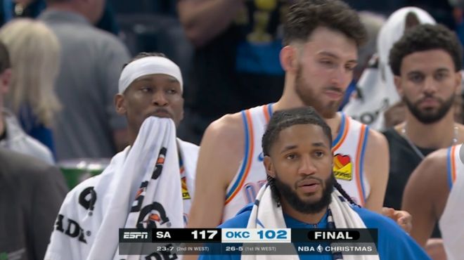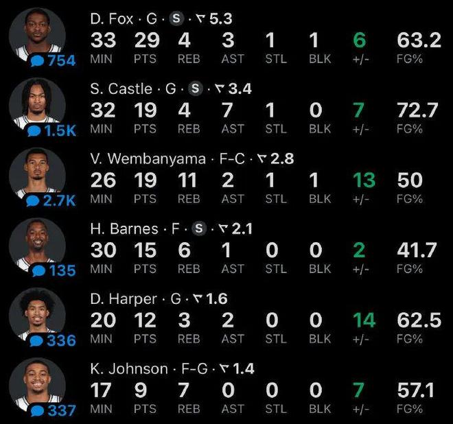 马刺福克斯、卡斯尔、哈珀三后卫齐飙,主打一个分工合作,干活不累,福克斯一个包揽上半场,卡斯尔、哈珀统领下半场,用突破把防守天下第一的雷霆突成了突突。福克斯高效轰下29分4篮板3助攻(19中12,3分4中4),最佳新秀卡斯尔同样高效砍下19分7助攻(11中8),哈珀替补8中5拿下12分3板2助,既雪中送炭又锦上添花。文班亚马又成功引爆了超级第六人核爆实验,继续替补26分钟,炸出了19分11篮板2助(12投6中,3分3中2)