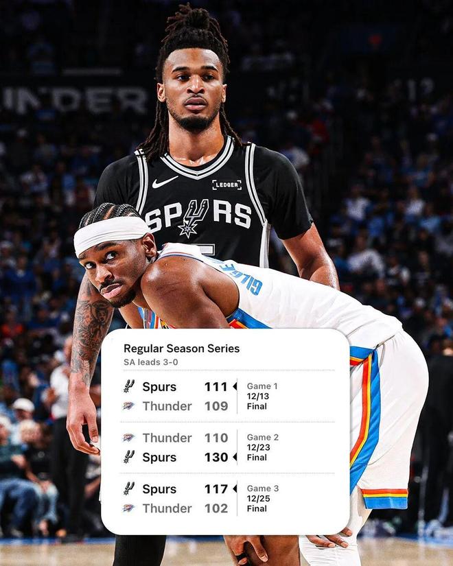 这是雷霆自2021-22赛季以来第一次连续两场输至少15分终于有球队能治这支被称作版本无敌的雷霆了!马刺打的就是精锐。三杀雷霆后,马刺豪取8连胜,23胜7负稳居西部第二,联盟第三,仅落后雷霆2.5个胜场差,如果再打两场雷霆,或许马刺就成功北伐登顶了!