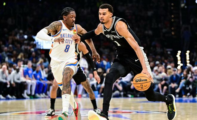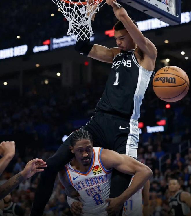 OKC这赛季在遇到马刺之前,几乎横扫一切,靠的是什么?历史级别的防守。他们的防守效率高居联盟第一,抢断联盟第二,利用失误得分联盟第一。能咬的人实在太多了。一旦防守上强度,打出反击,绝大多数球队就受不了啦。马刺怎么就不怕?关于文班亚马这个核武器,我们赞美太多次了。他这个点肯定是极其重要了,尤其在于防守端,基本一人搞定篮下的同时,还压住了霍姆格伦这组对位。但除了他,别忽略了一点,马刺可以处理球的人,是足够的。福克斯、瓦塞尔、卡斯尔、哈珀、凯尔登...还有索汉。现代篮球有一个明显的烙印,那就是追求体型、对抗、速度。马刺可以用雷霆欺负人的方式,去对待雷霆。这叫什么?“以其人之道,还治其人之身”。