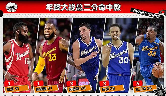 在比赛进行到第一节时,詹姆斯投中三分球。自此,他独享NBA圣诞大战历史上的三分王称号。此前,他与詹姆斯-哈登同以31记三分球并列排在第一名。比赛进行到第二节,詹姆斯4投2中得到了6分1篮板2助攻2抢断1失误,三分球3中1,罚球2中1,正负值-15。