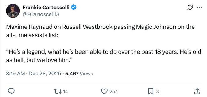 其次是威少生涯总助攻数超越魔术师约翰逊独占NBA历史第七。