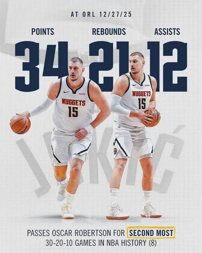 约基奇生涯至今,已经8次轰下30+20+10,NBA历史第二多,仅次于张伯伦的16次。16次单场15+15+15,独占NBA历史第一。最近五个赛季三双数量,约基奇123次遥遥领先,小萨博尼斯55次联盟第二,东契奇49次联盟第三。