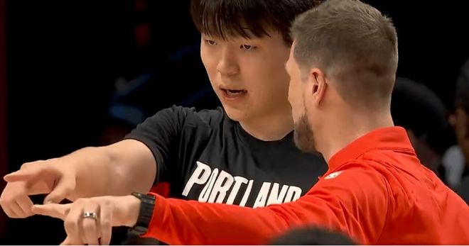 杨瀚森赛前主动和斯普利特沟通交流。