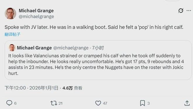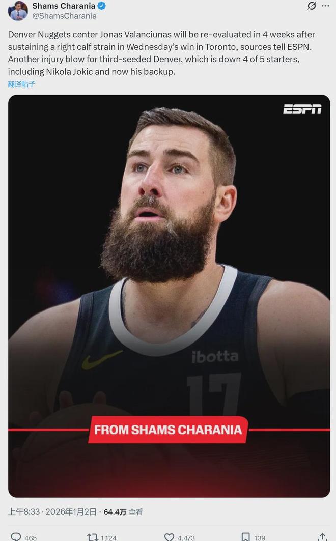 北京时间1月2日上午,NBA名记Shams Charania报道,掘金中锋瓦兰丘纳斯遭遇右小腿拉伤,将在4周后接受重新评估。Shams写道:“这对于排名西部第三的掘金来说,又是一次沉重的伤病打击,此前掘金已经有四名首发受伤!”