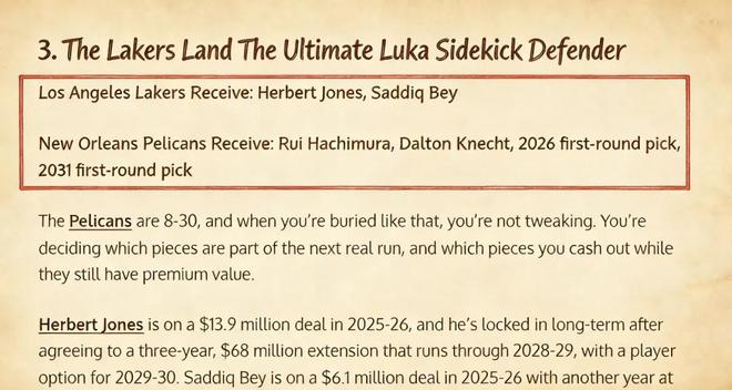 美媒《Fadeaway World》撰文建议,湖人应该打包将八村垒、克内克特、2026年首轮签以及2031年首轮签送到鹈鹕,换回对面的前锋琼斯和萨迪克·贝。