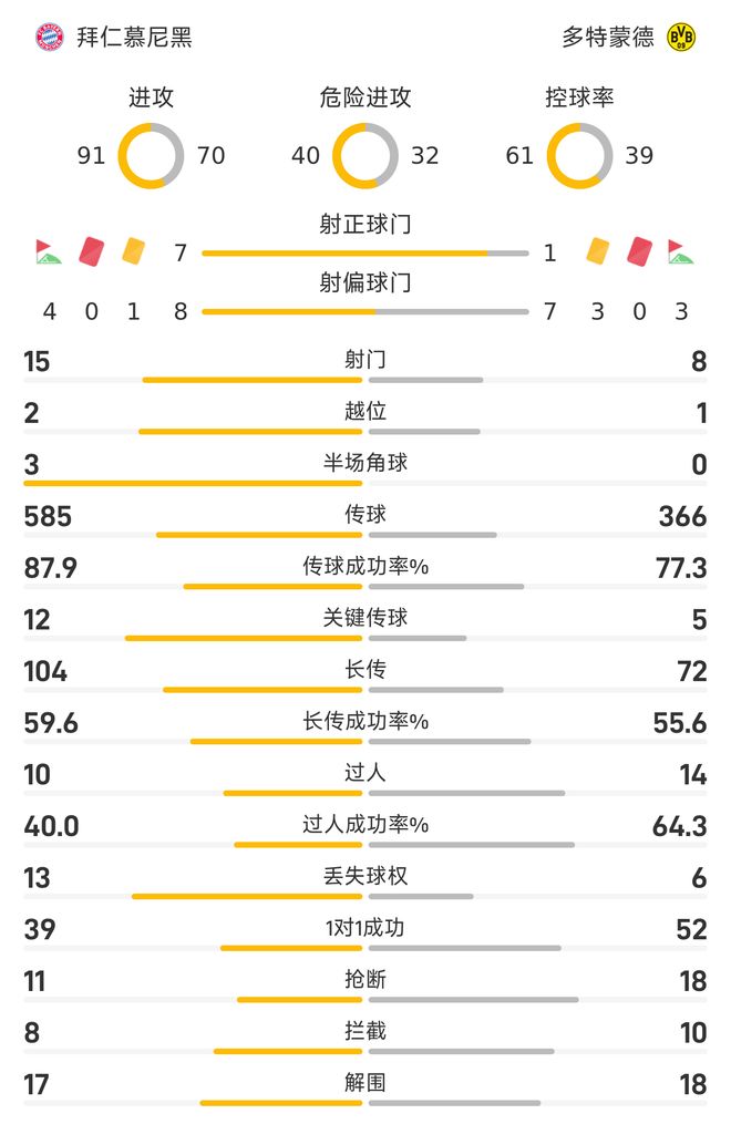 雷速体育10月19日讯 德甲第7轮,拜仁慕尼黑主场以2-1力克多特蒙德。纵观全场比赛,拜仁在数据方面占据着压倒性的优势,赢下这场国家德比着实实至名归。在这场比赛里,拜仁在射门方面以15-8明显占优;其中在射正方面,拜仁更是以7-1遥遥领先。在控球率方面,拜仁也以61-39%明显占优。在传球方面,拜仁以585-366远远高出对手;在传球成功率方面,拜仁以87.9%-77.3%同样占优;其中在关键传球方面,拜仁也以12-5明显高出对手。在过人方面,多特以14-10领先;过人成功率方面,多特也以64.3%-40%占据着上风。因为多特在长时间里,只能疲于防守,这也令球队的防守数据更占优,包括抢断(18-11)、拦截(10-8)和解围(18-17),皆是多特蒙德占据着领先的优势。技术统计