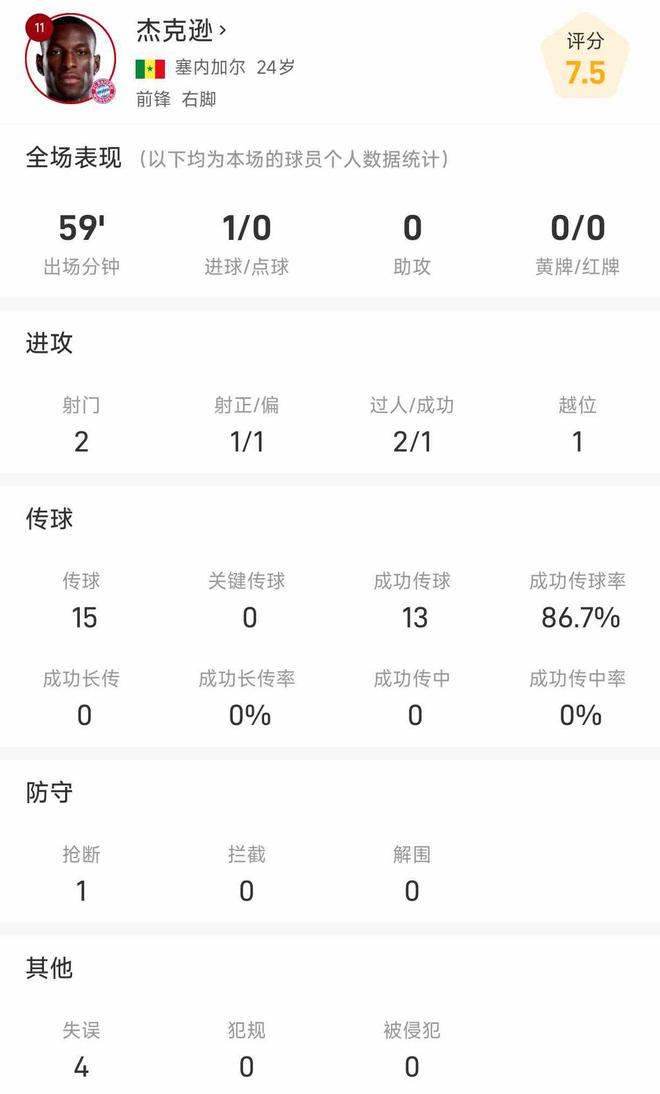 雷速体育11月2日讯 北京时间今天凌晨,拜仁在德甲比赛中3-0大胜勒沃库森,杰克逊本场比赛出场59分钟,比赛第32分钟打入1球。统计显示,杰克逊本场比赛2次射门,1次射正,打入1球。他2次过人1次成功。比赛中他1次越位。15次传球13次成功。防守层面,他贡献了1次抢断。在比赛中,他4次失误。