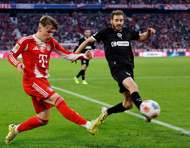 圣保利上赛季重返德甲后成功保级,这赛季开赛2胜1平之后直接吃到一波8连败,排名直接跌到了倒数第三。上周欧冠停赛的迪亚斯重返首发与卡尔、凯恩、格雷罗组成进攻线;帕夫洛维奇、基米希双后腰;莱默尔、金玟哉、塔、比朔夫搭档后防线,门将依然是诺伊尔。比赛开打后,拜仁意外率先丢球,第6分钟,莱默尔后场持球被逼抢的拉格成功抢断,金玟哉判断落点失误被洪通吉强行超车,后者趟入禁区面对诺伊尔低射近角得手,0:1!拜仁已经是连续4场比赛率先丢球了;而进球的洪通吉之后便因为大腿受伤无法坚持被换下。