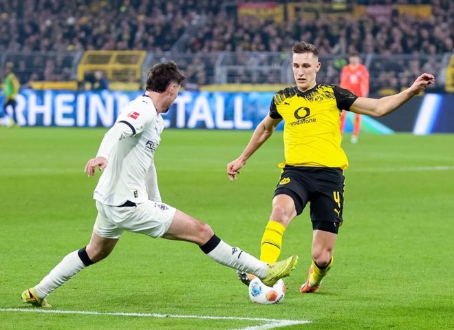 下半场易边再战。第53分钟,埃姆雷-詹踢人犯规,被出示黄牌。随后,吉拉西破门,但因为越位被吹掉。第60分钟,阿德耶米抢断射门。门将飞身扑救化解险情。第88分钟,拜尔获得单刀机会,但是,他的射门被门将扑了出去。补时阶段,拜尔在禁区中路低射破门,杀死比赛!最终,多特蒙德2-0完胜门兴格拉德巴赫。