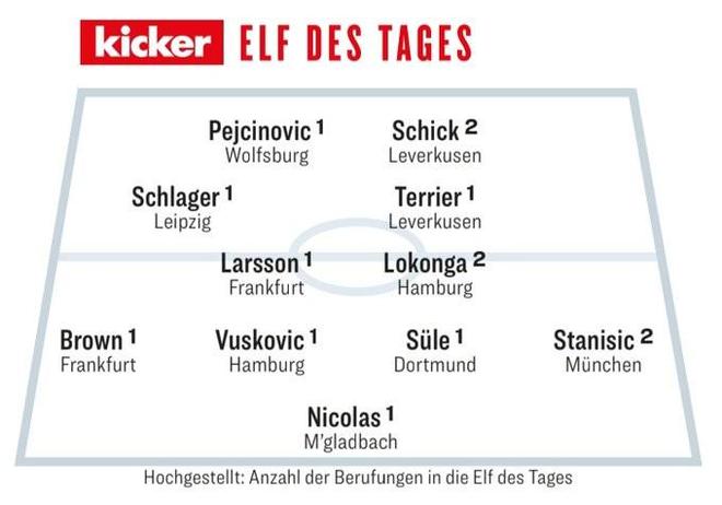 《踢球者》评德甲第15轮最佳阵容:前锋:佩契诺维奇(沃尔夫斯堡)、希克(勒沃库森)中场:施拉格尔(莱比锡)、胡戈-拉松(法兰克福)、洛孔加(汉堡)、泰里耶(勒沃库森)后卫:纳撒尼尔-布朗(法兰克福)、卢卡-武什科维奇(汉堡)、聚勒(多特)、斯塔尼希奇(拜仁)门将:莫里茨-尼古拉斯(门兴)