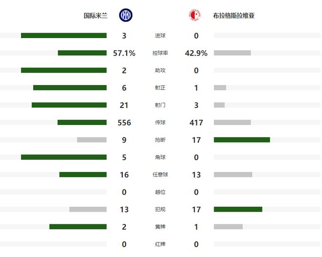 在主裁判吹响比赛开始哨声后,国米就在主场球迷的助威声中,朝着布拉格斯拉维亚的球门发起了猛攻,第7分钟右侧角球开出后,邓弗里斯的打门没有压住,直接放了高射炮,6分钟之后,图拉姆大禁区前沿开炮,又被客队门将飞身扑出。前半个小时防守端表现不俗,扛住蓝黑军团猛烈攻势的布拉格斯拉维亚,在第32分钟出现了巨大的失误,门将出球力量太小,直接给了劳塔罗打空门的机会,蛮牛也是笑纳大礼,帮助国米取得了1-0的领先,2分钟之后,国米扩大领先优势,图拉姆左路下底传中,邓弗里斯门前包抄建功,帮助蓝黑军团带着2球领先,回到了更衣室。