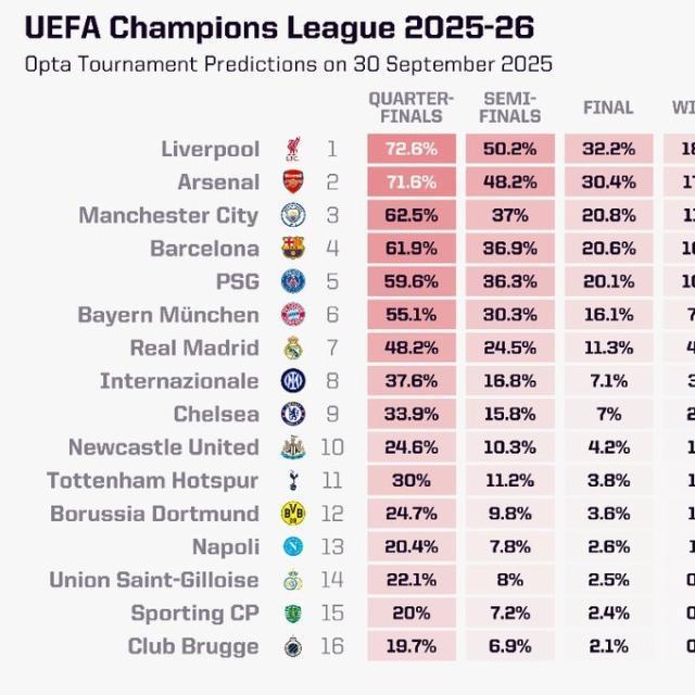 09月30日讯 欧冠联赛阶段第二轮开赛在即,opta超级计算机更新了欧冠夺冠概率,其中利物浦位列榜首,阿森纳、曼城分列二三。opta欧冠夺冠概率1.利物浦 18.64%2.阿森纳 17.44%3.曼城 11.45%4.巴萨 10.51%5.巴黎 10.31%卫报:以色列或被禁止参加欧足联赛事,但仍可能继续参加世预赛