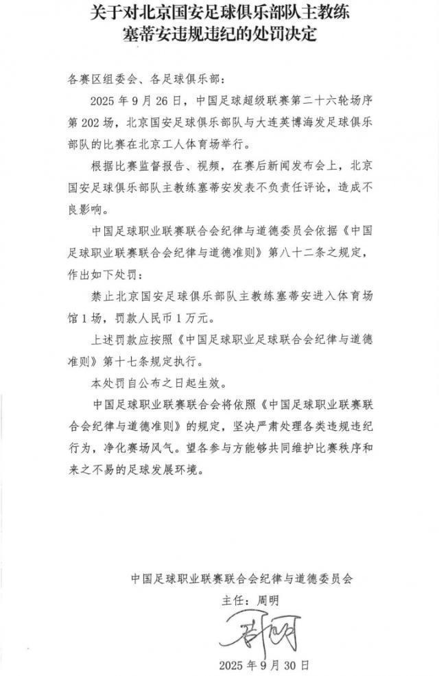 09月30日讯 中足联官方消息,北京国安主帅塞蒂恩在对阵大连英博的赛后发表不负责任评论,禁赛1场罚款1万。在4比2击败大连英博的赛后,塞蒂恩在谈到两个丢球时表示:“其实这两个失球是不应该出现的,但是之后我们有了很好的机会也取得了进球。但是我不理解为什么当时判定了我们的犯规,因为那个时刻裁判看的是很清楚的,但是之后又回看了录像取消了进球。”O77变177!湖人官方公布东契奇体重为104公斤 上季最重122.5公斤