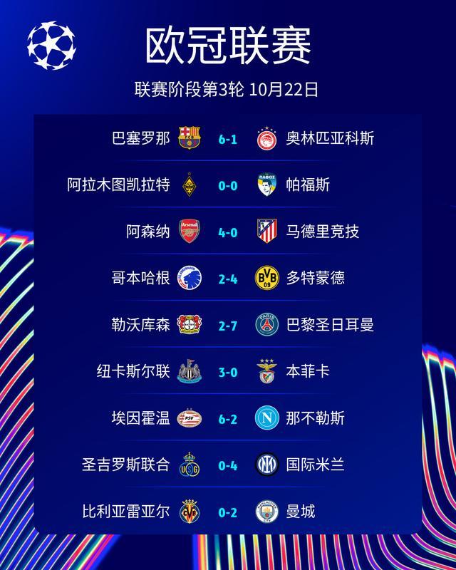 至此,本赛季欧冠第3轮首日的9场比赛战罢,仅有1场未产生进球,结果分别为:巴塞罗那6-1奥林匹亚科斯、阿拉木图凯拉特0-0帕福斯、阿森纳4-0马德里竞技、哥本哈根2-4多特蒙德、勒沃库森2-7巴黎圣日耳曼、纽卡斯尔联3-0本菲卡、PSV埃因霍温6-2那不勒斯、圣吉罗斯联合0-4国际米兰、比利亚雷亚尔0-2曼城!