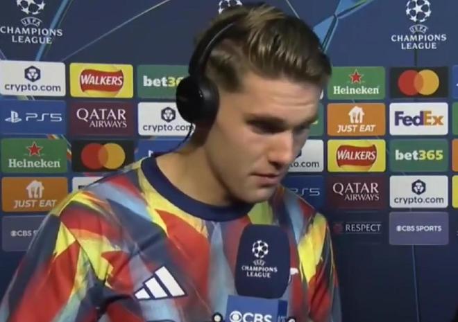 欢迎来到节目,维克托!先和观众们打个招呼吧。大家好!今天太出色了,梅开二度帮助球队取胜,感觉怎么样?这可是你加盟阿森纳后的欧冠首球,还是两个!感觉太棒了。我们整场比赛都踢得很好,能为阿森纳打进欧冠首球,而且一进就是两个,真的太不可思议了。之前你一直很努力,为球队战术体系拉扯空间、给队友创造内切机会,但始终没能收获进球,那段时间会不会很沮丧?当然,作为球员肯定想为球队做贡献,但前锋的职责就是进球,没能破门的时候确实会沮丧。不过我知道必须坚持下去,相信进球总会来的——今天终于等到了。加盟阿森纳后,要适应新战术和英超强度,这个过程顺利吗?你之前也在英格兰踢过球,但这次是更高水平的挑战。肯定需要适应期,要熟悉队友、理解战术打法和球队的比赛风格,和之前的环境确实不一样。适应需要时间,但现在一切都在往好的方向发展,从比赛表现也能看出来,感觉很棒。阿森纳的定位球战术太出色了,你们平时会花很多时间训练吗?这简直是球队的秘密武器。我们确实会专门训练定位球,但具体的战术细节就不方便透露了。关键是我们不仅练得多,还带着强烈的求胜欲去执行,所以效果才好。首先恭喜你进球和球队获胜!想问问你个人和阿森纳本赛季的目标是什么?联赛和欧冠双线争冠会不会太贪心?首先,我们的首要目标肯定是赢得冠军,这是全队的愿望,也是最重要的。对我个人来说,除了进球,还要不断提升自己的球技。至于联赛和欧冠双线争冠,我觉得完全可以尝试,这对我们来说是合理的目标。维克托,你穿的14号球衣意义非凡,阿森纳的14号可是传奇号码(亨利曾身披此号码)。穿上这件球衣会不会感到压力?毕竟大家会期待你像前辈一样成为进球核心、带领球队夺冠。说实话,能穿上这件球衣很荣幸。我知道这件球衣承载着很多进球荣耀,现在我要做的就是延续这份荣耀,打进更多球。这种期待对我来说是动力,感觉很棒。你没带件球衣来节目吗?能送我一件吗?(笑)这个得问俱乐部才行,不过没问题,之后可以给你安排。是你自己选择14号的吗?是不是想主动承担这份责任,继承亨利的衣钵?其实当时可选的号码不多,但看到14号有空缺时,我立刻就想拿下它——能穿上这个号码是巨大的荣誉。可惜没能提前问问亨利前辈的意见,但能穿上它,我真的很自豪。亨利:维克托,14号不是我的专属,只是我曾用过而已。现在它属于你了,希望你好好对待它,多进球——这就是我们最需要的。如果你想要我其他号码,之后可以在社媒上跟我说。【上咪咕独家看英超】