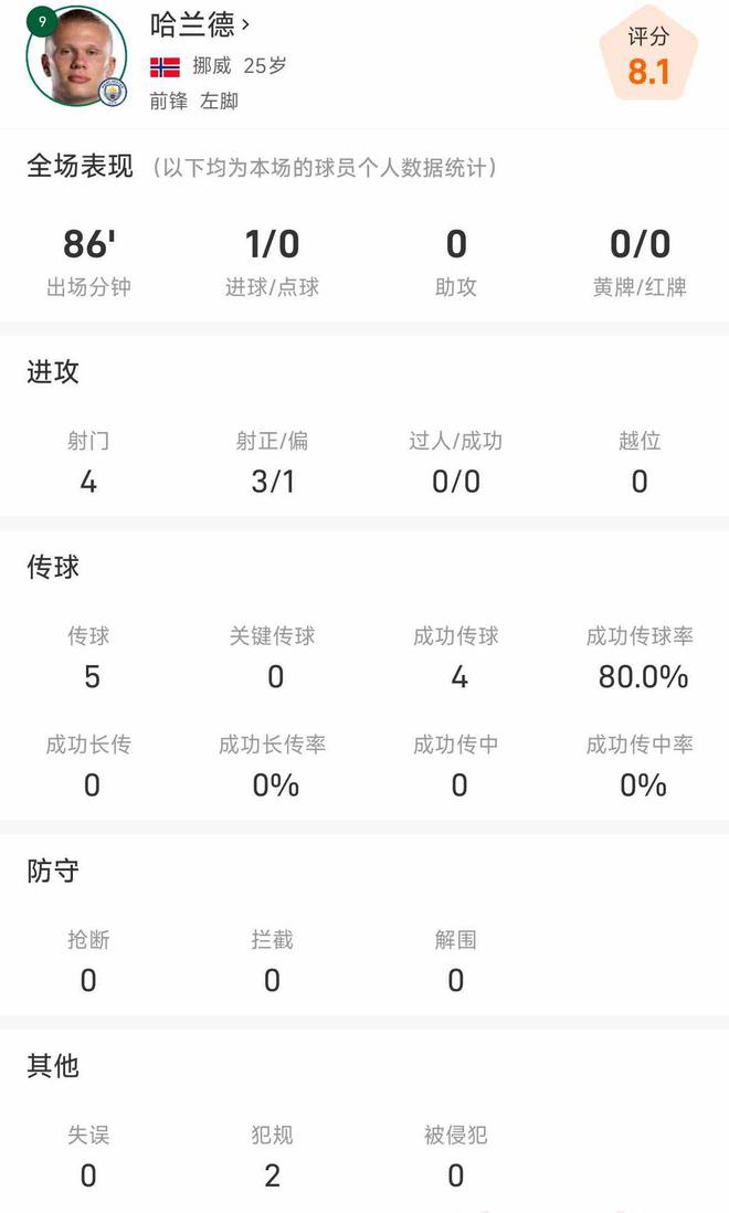 哈兰德数据:4次射门打入1球,全场仅5次传球