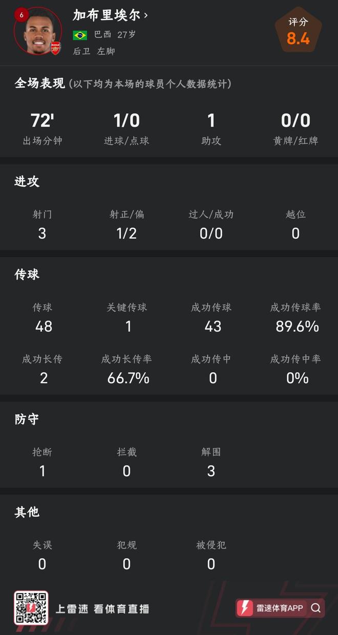 赛至第57分钟,加布里埃尔前插到门前接应赖斯任意球传中抢点冲顶破门,打破僵局。第70分钟,加布里埃尔接应赖斯角球传中争顶摆渡,助攻哲凯赖什攻入彻底锁定胜局一球。该场对决,加布里埃尔首发出场且出战72分钟,全场3次射门1次射正,攻入1球。传球方面,加布里埃尔全场48次传球(含1次助攻),其中43次传球成功,传球成功率达到89.6%。防守端,加布里埃尔全场1次抢断、3次解围。值得一提的是,加布里埃尔此役没有失误亦没有犯规。