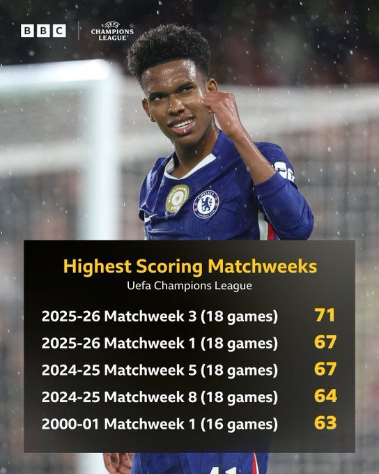 雷速体育10月23日讯 欧冠联赛阶段第3轮战罢,在本轮的18场比赛里,总共出现了71个进球,场均进球达到3.9个,这也刷新了史上欧冠单轮进球最高的纪录,在此之前单轮进球数纪录是67粒。在本轮的比赛里疯狂进球的比赛,包括巴塞罗那6-1狂胜奥林匹亚科斯、埃因霍温6-2逆转那不勒斯、巴黎圣日耳曼7-2狂胜勒沃库森、多特蒙德4-2逆转哥本哈根、切尔西5-1大胜阿贾克斯,以及利物浦5-1逆转法兰克福等较量,一轮比赛出现如此之多进球盛宴,放在欧冠历史上,也成为相当罕见的一幕。