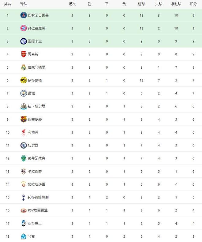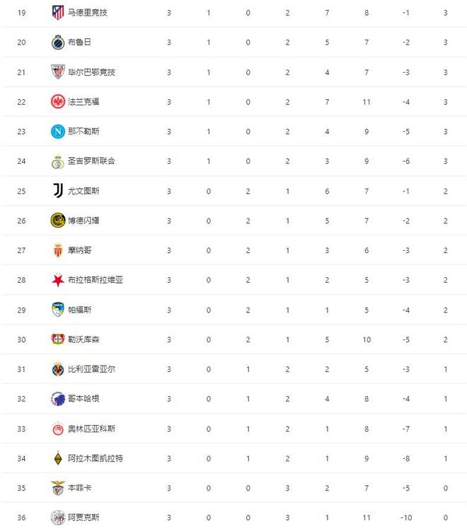 欧冠历史上,两队在2005-06赛季小组赛碰面过,当时拜仁主场1-0取胜,客场1-1打平布鲁日。开场仅仅5分钟,拜仁取得了梦幻开局,17岁小将伦纳特-卡尔轰出一脚世界波破门,随后第13分钟,莱默尔送出横传助攻,凯恩轻松包抄破门,打进本赛季欧冠第5球,帮助拜仁2-0再下一城。第33分钟,迪亚斯禁区大力抽射破门,帮助拜仁3-0扩大领先优势。下半场第79分钟,雅克松替补破门,帮助拜仁4-0锁定胜局。切尔西VS阿贾克斯 欧冠历史上,两队在2019-20赛季小组赛碰面过,当时切尔西客场1-0取胜,主场4-4打平阿贾克斯。这是两支冠军球队之间的较量,开场第16分钟,阿贾克斯遭到打击,队长泰勒滑铲铲到博纳诺特脚踝被直红罚下。切尔西多打一人之后,马上取得了进球,第17分钟通过任意球进攻由吉乌完成破门,随后第27分钟,凯塞多远射折射后入网,帮助切尔西2-0再下一城。第30分钟,哈托禁区内踩到阿贾克斯球员送点,随后韦霍斯特点射破门,帮助阿贾克斯1-2扳回一城。上半场结束之前,切尔西两次获得点球,恩佐、埃斯特旺各自主罚命中,帮助球队4-1领先结束了上半场。下半场,乔治的破门,帮助切尔西5-1锁定胜局。最新积分榜如下:
