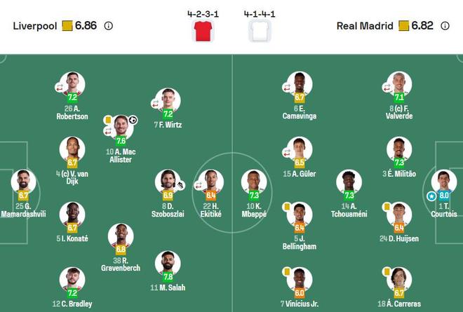 下半场开始不久,门将库尔图瓦在一次角球防守中扑出了范戴克近距离头球攻门,但皇马还是守不住。第61分钟,索博斯洛伊主罚任意球传到门前,麦卡利斯特前点头球顶进,帮助利物浦1-0打破僵局。此后比赛,双方均未改写比分,最终利物浦主场一球小胜皇马。赛后,著名足坛数据网站sofascore给两队的评分,具体如下: