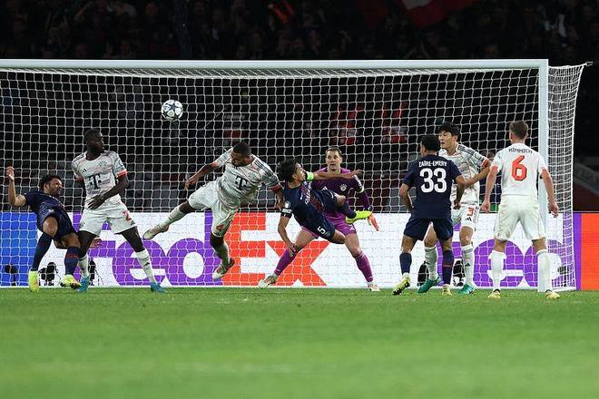 北京时间11月5日凌晨,欧冠联赛第4轮,迎来一场巅峰对决,卫冕冠军巴黎圣日耳曼主场迎战拜仁慕尼黑。比赛开始后,双方很快就进入状态,第4分钟,巴黎圣日耳曼后场出球有些随意,拜仁抢断过后立即投入快速反击,格纳布里精妙传球,奥利塞的单刀被门将扑出,迪亚斯跟进补射得手,拜仁1-0巴黎圣日尔曼,,第32分钟,拜仁的极限施压导致巴黎后卫出球失误,迪亚斯抢断成功后带球至禁区抽射破门,完成梅开二度。半场补时阶段,迪亚斯凶狠飞铲,阿什拉夫受伤下场,经过视频回放确认后,主裁判直接向迪亚斯出示了红牌。比赛中。图源:视觉中国下半场第73分钟,巴黎圣日尔曼球员传球至禁区,若昂·内维斯抢射破门,为主队扳回一球。最终,拜仁在客场2-1力克巴黎圣日耳曼,升至欧冠联赛榜首。