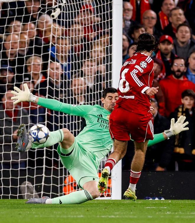 随着主裁判一声哨响,两支球队就摆开架势对攻,第10分钟维尔茨前场积极抢断后回传,麦卡利斯特大禁区前沿完成一脚远射,但皮球没有能够命中目标,8分钟之后,以22岁128天超越卡西成为欧冠历史最年轻50场先生的贝林厄姆,为姆巴佩做球,可惜法国利剑一脚高射炮踢飞了皮球。第28分钟利物浦创造出了一次极具威胁的反击机会,维尔茨右路横敲,索博斯洛伊跟进的推射被库尔图瓦神扑化解,半场比赛结束之前,非常活跃的索博斯洛伊大禁区外开炮,库尔图瓦单掌将皮球挡出底线,靠着门将的神勇发挥,皇马艰难带着0-0的比分回到了更衣室。