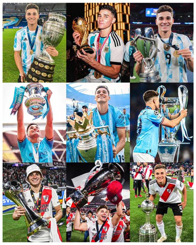 FF 你也去皇马试训过,对吗?JA 没错,那是我11岁时,父亲陪我去西班牙待了20天,我跟着皇马少年队训练了几次,然后在佩拉拉达赢得了一项锦标。当时如果留在马德里,家人都会过来跟我一起生活,那种感觉很美妙,但对我来说还是太早了。FF 作为中锋,你的身高只有1米7,是否有人认为这是你成为职业球员的阻碍?JA 我还记得自己在河床的第一堂试训课,教练问我年龄和位置,我回答说:“2000年1月出生,踢9号。”有人指着旁边一位大个子说:“9号?你这个年龄的9号,应该是这样。”但我无所畏惧,因为我清楚自己的能力。我可以踢9号,或者后撤一点、扮演影锋;在两个边路活动,我也完全能适应。FF 2018年,你跟随河床赢得了南美解放者杯;3年后,你又代表国家队赢得了美洲杯,然后是阿根廷人等待了36年的大力神杯……你是吉祥物吗?JA 一切成功,在我身上发生得太快了。除了在河床和国家队,我在曼城也是收获颇丰,刚到英格兰就成为了三冠王,见证了俱乐部历史上第一次欧冠登顶。但我没觉得自己是吉祥物,我只是在正确时机到达了正确位置。运气成分之外,是努力工作的态度以及把握机会的能力。