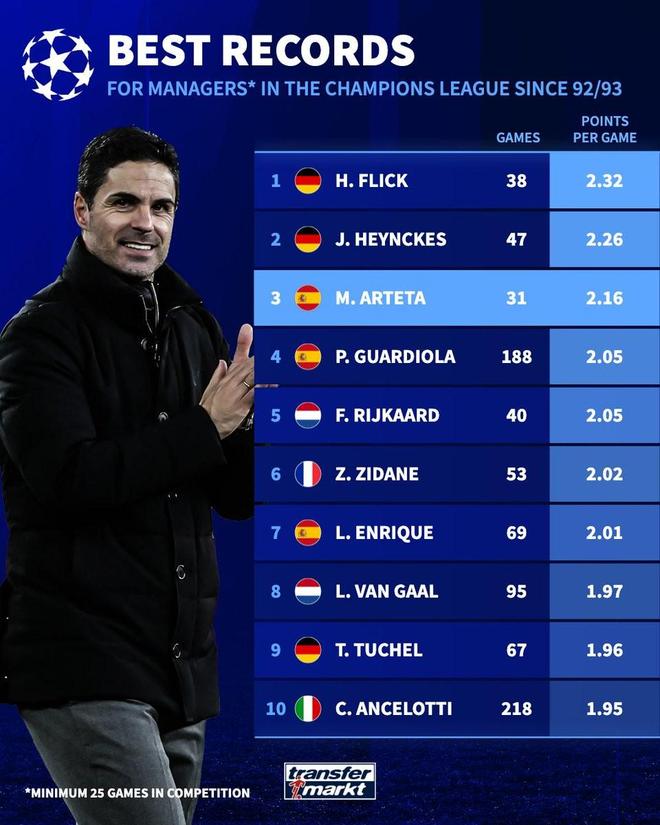 欧冠联赛阶段第7轮,阿森纳客场3-1击败国米。据德国转会市场网站统计,在执教欧冠至少25场的主帅中,阿尔特塔场均积分仅次于弗里克和海因克斯。
