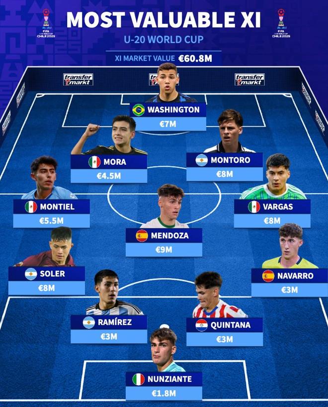 德转本届U20世界杯最贵11人阵容:门将农齐安特(意大利U20/乌迪内斯)180万欧元后卫保-纳瓦罗(西班牙U20/比利亚雷亚尔)300万欧元、卢卡斯-金塔纳(巴拉圭U20/波特诺山丘)300万欧元、托维亚斯-拉米雷斯(阿根廷U20/阿根廷青年人)300万欧元、胡利奥-索莱尔(阿根廷U20/伯恩茅斯)800万欧元中场奥贝德-巴尔加斯(墨西哥U20/西雅图海湾人)800万欧元、罗德里戈-门多萨(西班牙U20/埃尔切)900万欧元、埃利亚斯-蒙铁尔(墨西哥U20/帕丘卡)550万欧元前锋阿尔瓦罗-蒙托罗(阿根廷U20/博塔弗戈)800万欧元、戴维德-华盛顿(巴西U20/切尔西)700万欧元、希尔韦托-莫拉(墨西哥U20/蒂华纳)450万欧元总价:6080万欧元【上咪咕独家看