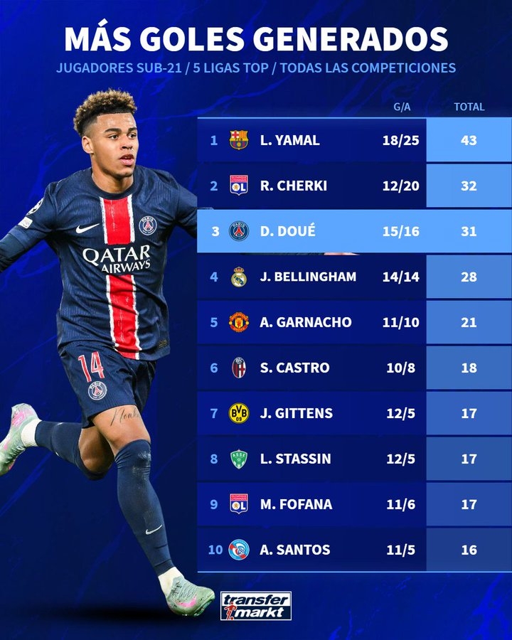 06月02日讯 德转统计了本赛季五大联赛21岁及以下球员的进球+助攻数据,杜埃凭借在欧冠决赛的2球1助,进球+助攻数突破30,来到进球+助攻榜第三。