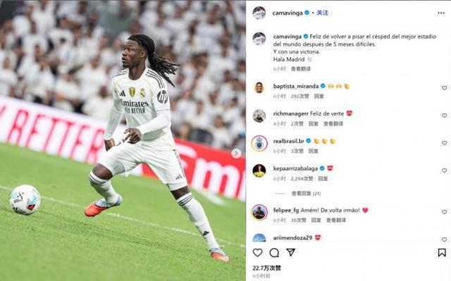 9月21日讯 皇马在本轮西甲焦点战2-0力克西班牙人,卡马文加最后时刻登场完成复出。他也在赛后通过社媒晒出自己的比赛照,并配文:“历经五个月艰难时光,很开心终于重新踏上世界最佳球场的草皮——且收获胜利。皇马加油”卡马文加在今年先后遭遇腘绳肌和踝关节伤势,上次为皇马出战还是4月。