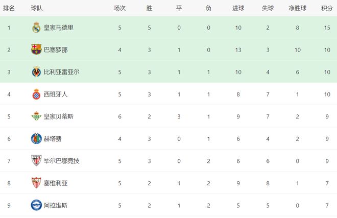 在积分榜上,皇马以15分独自领跑。皇马是唯一保持全胜的球队。巴萨紧随其后,3胜1平,拿到10分排名第2。巴萨比皇马少踢1场。比利亚雷亚尔和西班牙人也都是10分,排名第3和第4。皇家贝蒂斯、赫塔费和毕尔巴鄂竞技则都是9个积分。