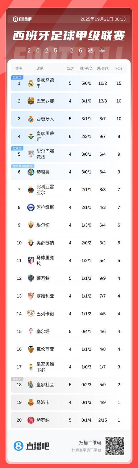 9月21日讯 西甲第5轮先赛多场,皇马战胜西班牙人赛季开局5连胜,现积分榜如下↓