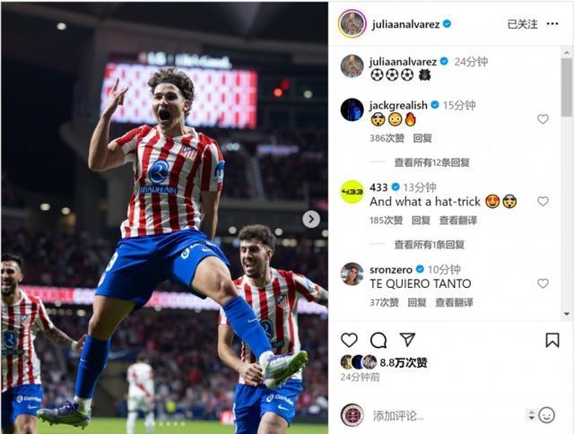 9月25日讯 西甲第6轮比赛,阿尔瓦雷斯打进3球,帮助马竞主场3-2击败巴列卡诺。阿尔瓦雷斯社媒晒出比赛照片,庆祝球队取胜+戴帽,配文:⚽️⚽️⚽️️格拉利什点赞留言: