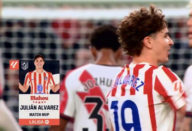 此役主场对阵巴列卡诺,阿尔瓦雷斯在上半场第15分钟破门为马德里竞技取得领先。在马竞被对手反超比分后,阿尔瓦雷斯再入两球,上演帽子戏法,帮助马竞3-2击败对手。本场比赛打满全场的阿尔瓦雷斯完成3次射正,获评满分10分。最终经过评选,阿尔瓦雷斯当选西甲官方全场最佳球员。