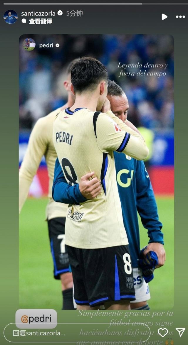 9月26日讯 西甲第6轮比赛,巴萨客场3-1击败皇家奥维耶多。赛后皇家奥维耶多40岁中场卡索拉与巴萨中场佩德里交流,并交换球衣。佩德里社媒晒出照片,配文:“场上场下都是传奇。”卡索拉转发佩德里的动态,写道:“感谢你的足球,朋友,让我们这些热爱这项运动的人继续享受吧!”
