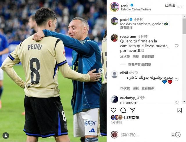 9月26日讯 西甲第6轮比赛,巴萨客场3-1击败皇家奥维耶多。巴萨中场佩德里更新社媒动态,晒出与皇家奥维耶多40岁中场卡索拉的赛后合照,对其表达敬意,配文:“天才,能把你的球衣给我吗?”