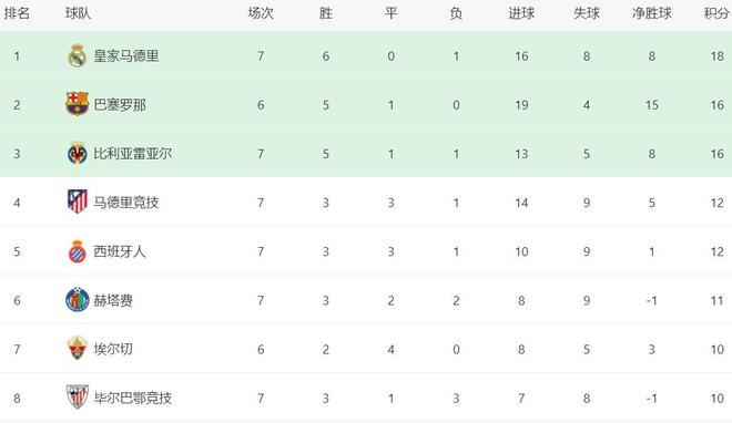 在积分榜上,皇马6胜1负,拿到18分,排名榜首。巴萨5胜1平,保持不败,以16分排名第2。皇马的优势只剩下2分,而且皇马比巴萨多踢1场。比利亚雷亚尔跟巴萨一样,也是16分,排名第3。马竞赢球之后,总积分达到12分,升到了第4名。西班牙人也是12分,因为净胜球的劣势,排名第5。