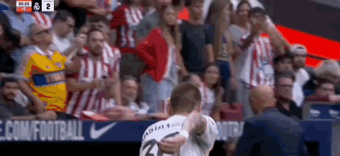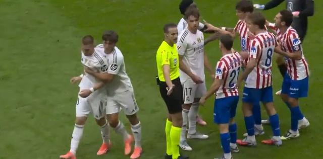 第90+4分钟,马斯坦托诺在边路被吹罚犯规,随后他对裁判抱怨了几句。此时,场边有球被扔进场内,这一举动激怒了这位首次参加马德里德比的18岁天才少年。只见这位年轻的阿根廷中场将球直接踢向了马竞球迷看台,以此发泄情绪。此举让他吃到一张黄牌,并引发了双方球员之间的短暂冲突,不过局势很快平息,幸好没有球迷受伤。