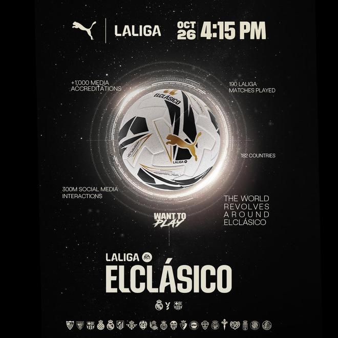 雷速体育10月9日讯 北京时间10月26日23:15,西甲第10轮,皇马在主场迎来与巴萨的本赛季首次西班牙国家德比。这场比赛的专属比赛用球已经揭晓。彪马和西甲联赛联合发布了专为本赛季西班牙国家德比打造的官方比赛用球。专属用球采用白色为底色,搭配醒目的黑色图案和金色标志。这将是两队第262次在正式比赛中相遇,在此前261次西班牙国家德比中,皇马以105胜52平104负的战绩略微占优势。同时,这也将是两队第191次在联赛中相遇,在此前190次联赛对决中,皇马以79胜35平76负的战绩同样略微占优。但在上赛季,皇马在各项赛事遭巴萨4连杀,其中2场联赛分别在主场0-4惨败、客场3-4告负。