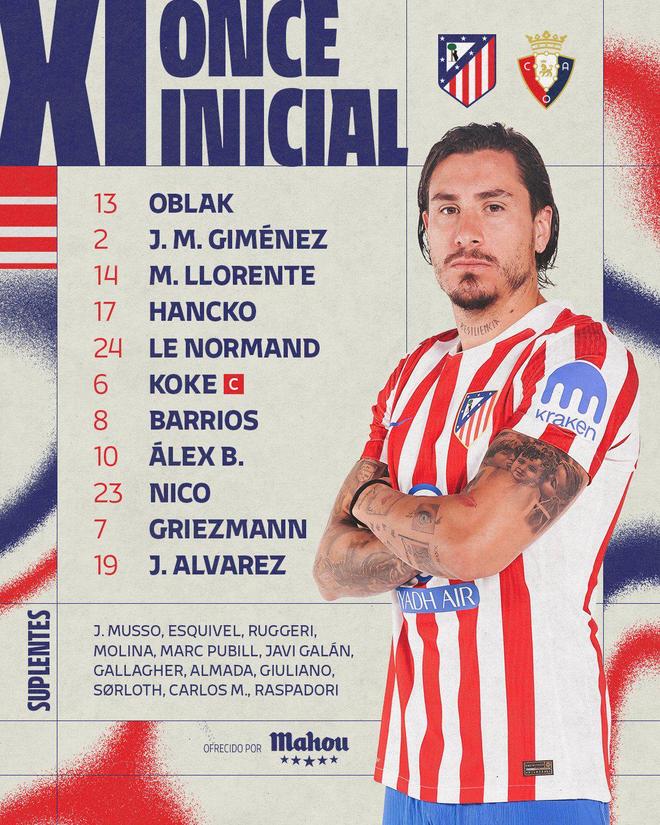 雷速体育10月19日讯 西甲第9轮马竞vs奥萨苏纳,赛前两队公布首发。