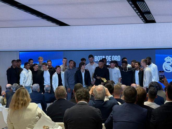 2024-25赛季欧洲金靴奖颁奖仪式在伯纳乌球场进行,皇马前锋姆巴佩上赛季以31粒西甲进球荣获这一奖项。皇马俱乐部主席弗洛伦蒂诺、主教练哈维-阿隆索和一线队全体球员出席仪式。在姆巴佩领取金靴奖后,皇马全队上台与姆巴佩以及金靴奖合影。